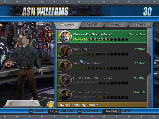In addition, his Boomstick power has been modified to fire slower, but deal more damage as befitting the hallmarks of a shotgun. He also has moves incorporating the Necronomicon Ex-Mortis to convert enemies into Deadites to both slow them down and deal continuous damage, but also to convert them into an Army of Darkness to fight for his own team as his XTreme!